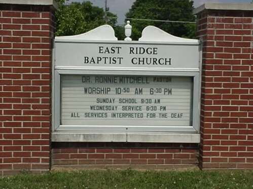 East Ridge Missionary Baptist Church was organized on Sunday, April 7, 1940, at 2:30 o'clock in "Miss Carey's Room" of the old abandoned East Ridge Schoolhouse at the corner of Ringgold Road and Marlboro Avenue. At least three abortive attempts had been made to begin a Baptist church in East Ridge before the church was organized. Later, Mr. Hugh Scruggs, Sunday School superintendent at the Brainerd Baptist Church, made at least two unsuccessful attempts to begin a permanent mission in the old East Ridge Town Hall, a building which stood on the northwest corner of Marlboro Avenue and Ringgold Road, across the street from the present site of East Ridge Baptist Church. The building was uninviting; Sunday School was held in the afternoon with no preaching; the teachers, with the exception of Mr. Scruggs, were irregular in attendance.